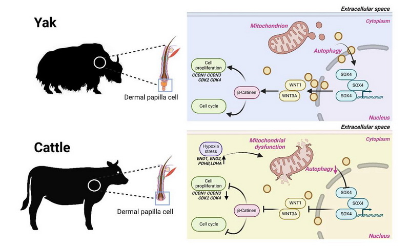 研究團(tuán)隊(duì)進(jìn)一步利用ATAC-seq與ChIP-qPCR發(fā)現(xiàn)了轉(zhuǎn)錄因子SOX4可直接結(jié)合WNT1與WNT3A基因的啟動(dòng)子區(qū)域,且這一結(jié)合對基因的轉(zhuǎn)錄激活作用通過雙熒光素酶實(shí)驗(yàn)得到驗(yàn)證。SOX4的表達(dá)受自噬水平調(diào)控,激活自噬可挽救SOX4抑制劑對DP細(xì)胞增殖的抑制作用。該調(diào)控通路在牦牛體中表現(xiàn)出更強(qiáng)的信號(hào)活性,通過促進(jìn)DP細(xì)胞周期進(jìn)程、增強(qiáng)細(xì)胞增殖能力來維持毛囊穩(wěn)態(tài);同時(shí),該通路還能改善線粒體結(jié)構(gòu)完整性以抵御氧化應(yīng)激,從而可能促進(jìn)毛囊生長,系統(tǒng)性增強(qiáng)牦牛對高原寒冷環(huán)境的生存適應(yīng)能力。總之,研究團(tuán)隊(duì)從單細(xì)胞水平解析了牦牛毛囊適應(yīng)高原寒冷環(huán)境的分子特征,為理解動(dòng)物對高原極端環(huán)境的適應(yīng)機(jī)制提供了重要基礎(chǔ)數(shù)據(jù)。