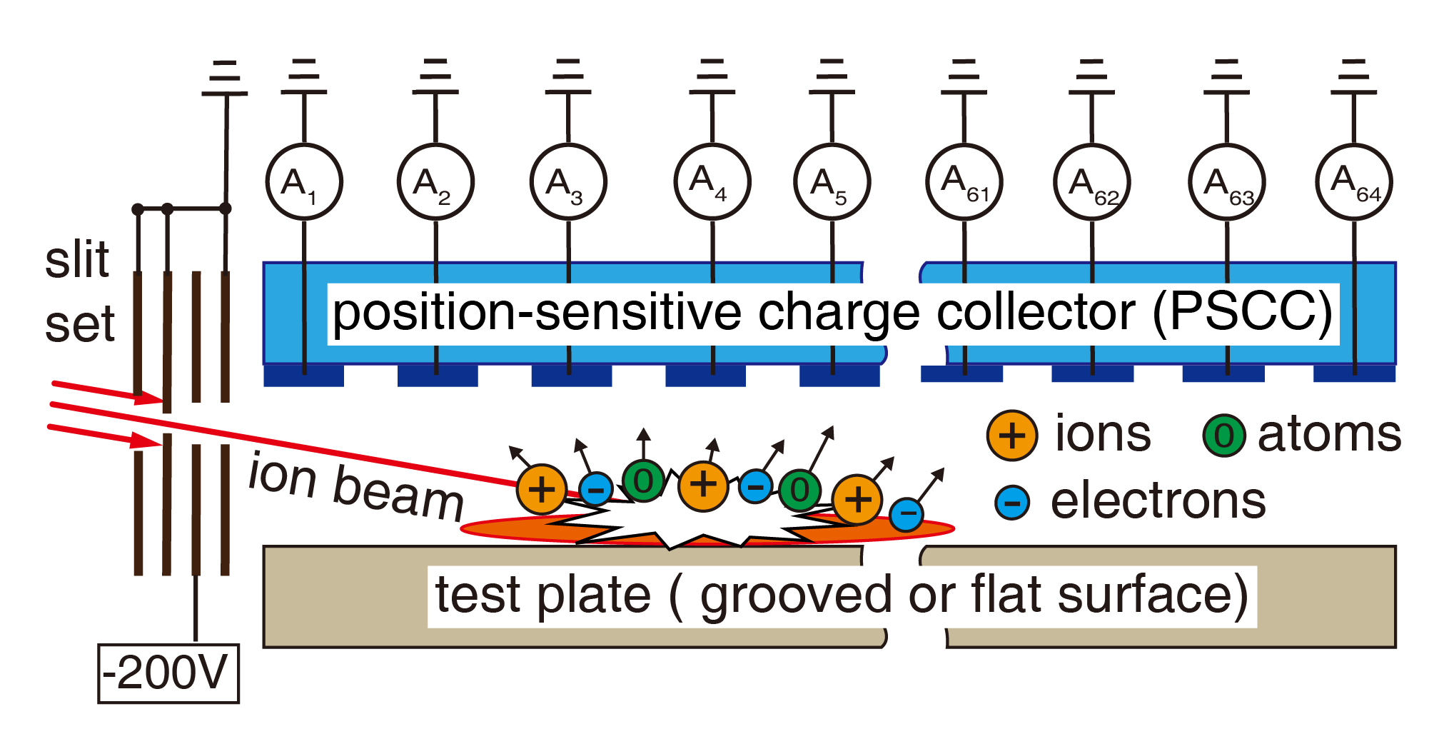 圖1:濺射離子電流分布測(cè)量。二次離子的電荷搬運(yùn)是導(dǎo)致導(dǎo)向電場(chǎng)過早飽和的主要原因;溝槽結(jié)構(gòu)可有效抑制二次離子的電荷搬運(yùn)